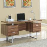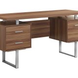 Create a functional workspace with fashionable style in your home office when you sit down to work at this contemporary 60″L computer desk with closed storage. The thick-panel easy to clean top provides generous room for a laptop, study and writing materials, and allows you to use the tops of the drawer units as extra surfaces. Finished on all sides in a warm walnut laminate, this desk offers 2 storage drawers on top for office essentials, and a bottom file drawer that includes metal bars for hanging standard or legal sized files. For flexibility, the drawer units have a reversible configuration and can be installed with a left or right setup according to your preference. Durably designed with a supporting sleek grey metal base in a modern U shape. Easy to assemble with full illustrated instructions included, this modern desk comes with a 5 year limited warranty against any defects for your comfort.