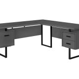 Give your home office a promotion with this extra-large, corner desk in a modern grey finish. The L-shaped, floating desktop is generously sized and leaves space to use the tops of the drawer units as shelves. A reversible configuration lets you set up the desk with the drawer units on either side as desired. The space between the 3 storage drawers allows ample room to easily move around your workspace. Providing support are 3 robust metal legs in a black finish that matches the drawer handles. This L-shaped computer desk saves space when used in a corner but is finished on all sides for a polished look wherever it is placed in a home office.