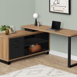 This stunning executive L-shaped desk will add style to any office space. Finished in light reclaimed wood-look it boasts two storage drawers and two open shelves finished in black which serve to accentuate its modern and minimalist design. The two-tiered work top provides a large work area and ample space to store your office essentials, and a solid black metal leg provides a stable base. The perfect computer desk for your home office, this spacious workstation elegantly combines a two-tone finish that your friends and colleagues will admire. Staying organized at home has never been so easy and fashionable!