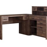 Help create a functional workspace with this contemporary, L shape corner computer desk that is finished on all sides in a reclaimed wood-look brown laminate, with a thick easy to clean top for your laptop, study, or writing spot in a home office. With fashionable style, this durably designed corner desk features a storage unit with a hutch and offers numerous open and closed storage options that include storage drawers in various sizes on metal drawer glides with finished interiors and accented with silver handles, a file drawer for standard or legal sized folders, 2 smaller cubbies on top and a larger cubby at the bottom with an adjustable shelf, plus the top of the hutch can be used as a shelf to place books and accents. For maximum convenience, this large desk has a reversible configuration for a left or right set-up for the storage unit with the hutch. A 5 year limited warranty is included for your convenience with full illustrated instructions and hardware for this easy to assemble desk.