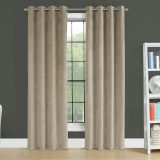 Bring a subtle luxe look to a room with this set of two room darkening curtain panels in a soft velvet finish that is machine washable. Each 52″W x 84″H curtain panel is made from room-darkening material to help filter out the light, giving a cozy ambiance to a space. The 8 silver metal grommets on each panel makes it a quick setup and the simple elegant lines of these beige curtains are versatile enough to hang in a livingroom, bedroom, or dining room. Curtain rod not included and must be purchased separately.