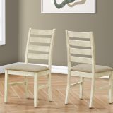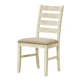 Introducing the ultimate dining chair set for your casual family dining experience. This set of 2 dining chairs with a warm antique white finish and upholstered in beige linen look fabric, is not only comfortable with foam cushioning, but the solid wood legs are durable with sturdy construction for long, lingering conversations at the dinner table. The ladder back design brings solid back support while adding a touch of fashionable style to your dining room or kitchen. With a 38″ height, these transitional style side chairs are the perfect addition for a chic dining table (sold separately). Easy to assemble with illustrated instructions included, these chairs are backed by a 2 year limited warranty against manufacturer defects, so you can rest assured these chairs are built to last.
