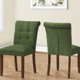 Add comfort and style to your casual family dining experience with this set of 2 upholstered, linen-look green fabric dining chairs. Standing at a 38″ height, these side chairs offer sturdy construction with the solid, brown walnut wood legs and thick foam padding on the seat and tufted, curved back, bringing some fashionable style to your dining room or kitchen. The illustrated instructions that are included makes these chairs easy to assemble and use right away. Backed by a 2 year limited warranty against any defects, these modern and comfortable dining chairs are a must-have for the trendiest of homes. Pair these with a chic dining table (sold separately) to create an inviting dining space.