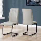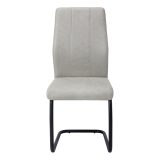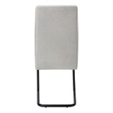 Show off these two up-to-the-minute kitchen chairs with confidence. They are made of a smooth faux-suede grey fabric with sturdy luxurious black metal bases in a U shape. Enjoy the enhanced comfy seat that will make a statement in your small home, apartment or condo. These armless dining room chairs will slide perfectly under the table to save space when not in use. Don’t forget to match with an identical kitchen table to complete your stylish kitchen or dining room collection.