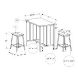 With a space saving design, this 3pcs set is backed by a 2 year limited warranty for your satisfaction; dining table: 35.5 in. L x 23.75 in. D x 36 in. H; each stool: 17.5 in. L x 12 in. D x 25 in. H; seat dimensions: 15.5 in. L x 9.75 in. D.