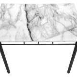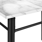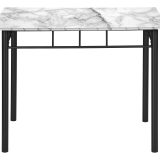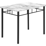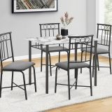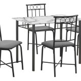 Welcome a casual family dining experience with this modern 5 piece set dining table set! It features a 40″ rectangular dining table with a stunning white marble look laminate top and a sturdy black metal base for a chic contemporary style. Perfect for a small kitchen or dining area, this space saving set easily accommodates up to 4 people. The armless chairs are upholstered in a thick grey cotton and linen mix fabric with matching black metal accents to provide comfortable seating for any meal. Easy to assemble with illustrated instructions and hardware included, this dining set also comes with a 2 year limited warranty against manufacturer’s defects to ensure your satisfaction. Enjoy a fashionable, reliable, and easy to clean dining table set that will last through many dinner parties and family meals.