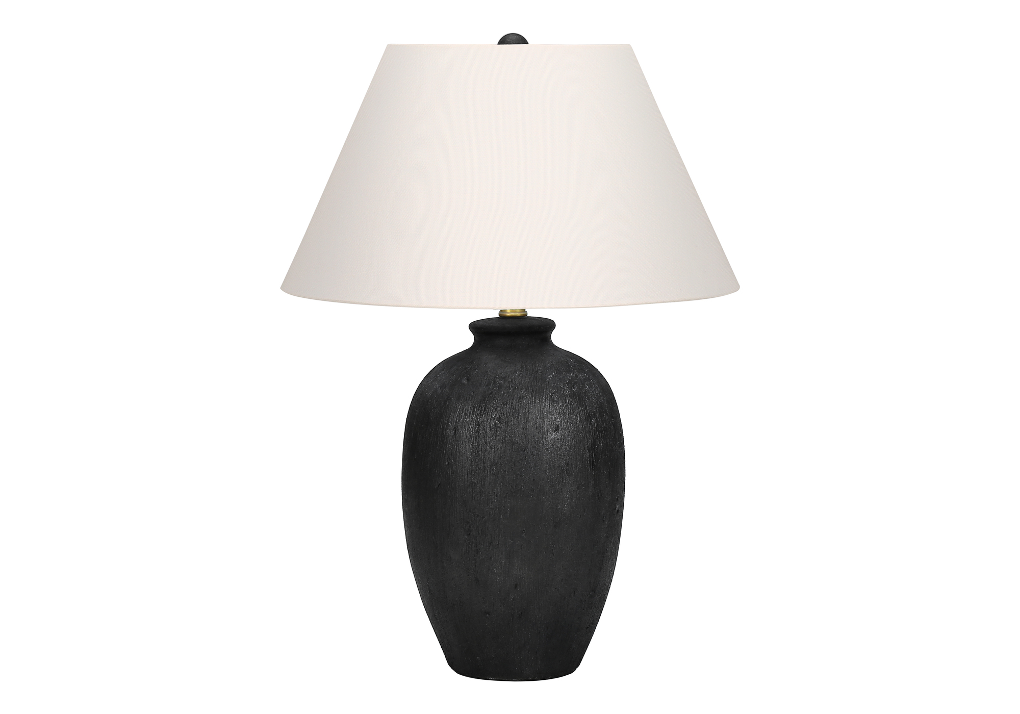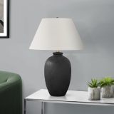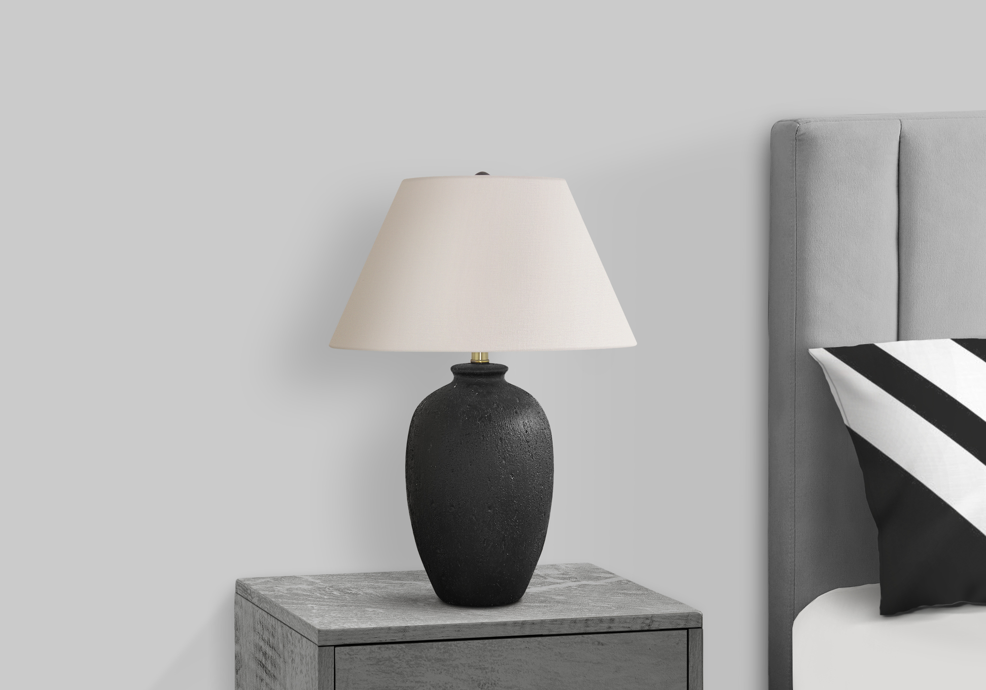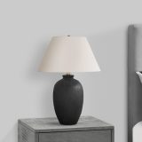 Bring some modern sophistication to any room with this stylish 24″h table lamp. A beautiful blend of a textured black ceramic vase shaped base and ivory linen empire shade, and finished with a round black finial on top, this lamp is a great way to brighten any bedroom, living room or office. Attached with a 5ft transparent cord and an easy to reach rotary switch, your room’s ambiance will be illuminated with a single bulb (not included) for a maximum outage of 60W/120V. This is the perfect functional accent to place on an end or side table, nightstand or bedside table. Made with quality materials, this lamp includes a 2 year limited warranty against any manufacturer’s defects for a worry-free purchase.