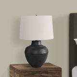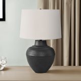 This sophisticated 26″h transitional style table lamp, designed in a classic urn shape black metal base with a textured finish and a simple ivory linen fabric shade, brings a grounding presence when placed on an end or side table in a living room or office, or on a nightstand in a bedroom. To illuminate your space, this lamp has a 3-way switch that houses a single bulb for a maximum output of 100W/120V (not included) to help create the perfect ambiance lighting. Made with good quality materials, this decorative accent is backed with a 2 year limited warranty against manufacturer’s defects for your convenience.