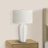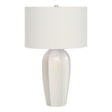 Bring some contemporary sophistication to any room with this stylish 27″h table lamp. A beautiful blend of art-deco with a modern edge, the smooth cream ceramic base in a tapered vase shape, is complimented with an elegant ivory linen drum shade, and finished with a silver metal finial on top. With a 3-way switch that houses a single bulb (not included) for a maximum output of 100W/120V, this lamp offers three levels of illuminating light for creating the ambiance you desire. Attached with a 5ft transparent cord, this is the perfect functional accent to place on an end or side table in a livingroom or home office, or bring it into your bedroom to set on a nightstand or bedside table. Made with high quality materials, this lamp includes a 2 year limited warranty against any manufacturer’s defects for a worry-free purchase.