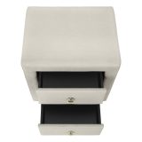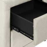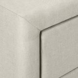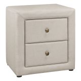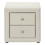 This upholstered nightstand demonstrates how minimalism can be both chic and sophisticated. The timeless and contemporary design emphasizes clean, rectangular lines and smooth surfaces. This bedroom accent features a foam-padded plywood frame, upholstered in beige linen-look fabric. The bronze-finished metal drawer knobs provide a contrast to this upholstered side table as an additional style element. This nightstand also features two storage drawers, giving you more places to store items at your bedside. This collection includes a matching bed (available in either Queen, Twin or Full size) which is sold separately.