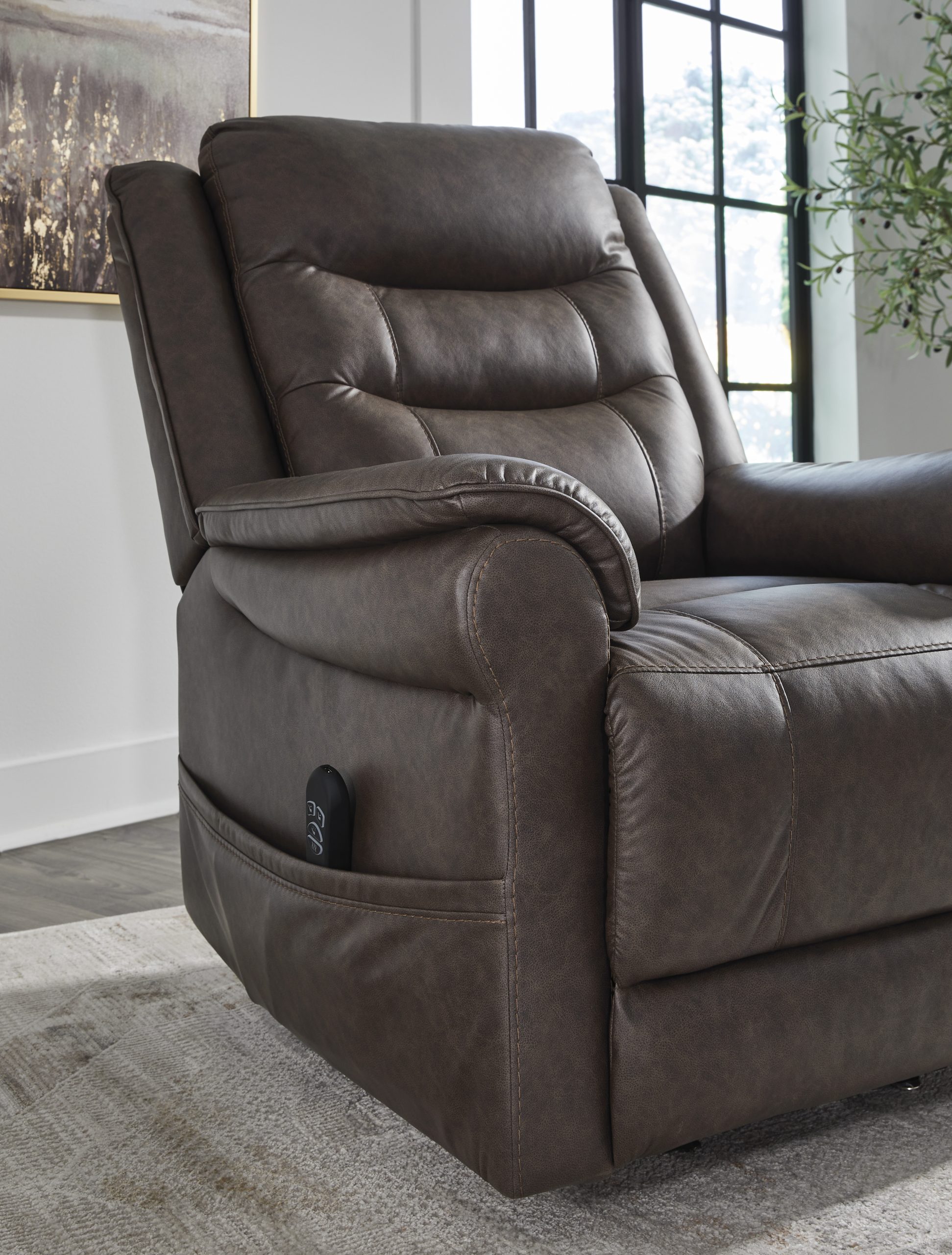 This power lift recliner is made for comfort and priced to put you at ease. Its supple faux leather invites you to sink in and stay a while, and the stitching details add a tailored, contemporary look. With a lift-and-tilt motion that brings you to your feet, plus heat and massage features, this recliner is crafted for affordable, everyday function.