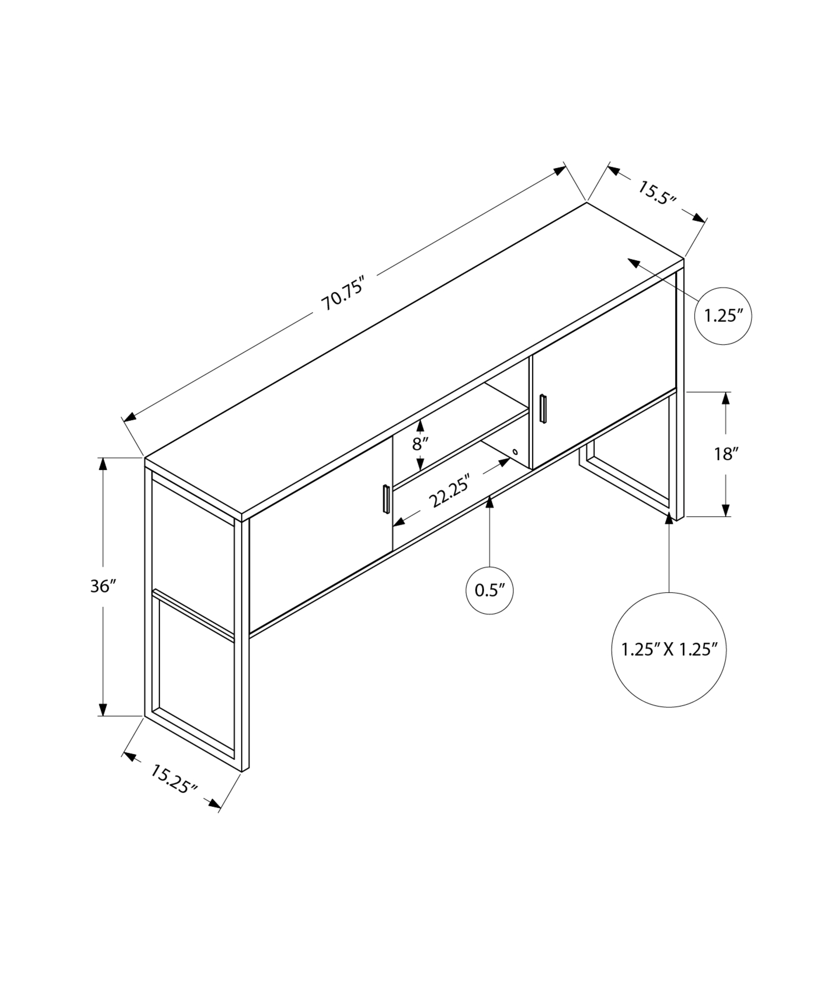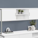 Introducing our sleek and stylish 72″l white laminate office hutch with silver metal supports to add on top of our office credenza (sold separately). The credenza connector included allows you to create a highly functional workspace, perfect for storing documents, study and writing materials, whether in a home office or commercial setting. Crafted to meet ANSI / BIFMA quality safety standards and built to last with a 5 year limited warranty against any defects. This commercial grade hutch features a fixed shelf along the entire length with closed cabinets at both ends, providing ample storage space for your office essentials. The durably designed hutch is easy to assemble with illustrated instructions included and features a fully finished back, making it a versatile addition to any office setting. The easy to clean top ensures maintenance is a breeze, while the storage doors keep your items organized and within reach. Upgrade with this connecting office hutch and create a practical and chic workspace with fashionable style!