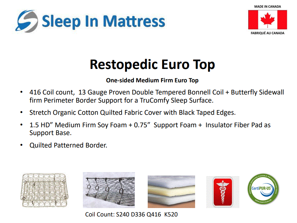 - 416 Coil count, 13 gauge proven double tempered bonnell coil + butterfly sidewall firm perimeter border support for a trucomfy sleep surface