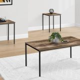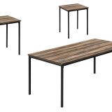Create a stylish living room setup with this 3 piece table set. This fashionable set includes one coffee table and two end tables, each with a sleek brown reclaimed laminate top and durable black metal frame. The contemporary design and clean lines of this set will add a modern touch to any living area. The elegant and easy to clean tops are great for everyday use, and the set is easy to assemble with full illustrated instructions included. Plus, each durably designed piece comes with a 5 year limited warranty so you can feel assured you are buying quality furniture that will last. You will bring an instant update to your home with this on trend coffee table set.