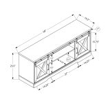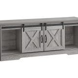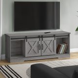 Bring a little bit of country and a lot of style into your home with this TV stand. Barn-style sliding doors are suspended from a black metal track and roll smoothly to conceal and reveal the storage areas as desired. In the middle are 2 wide shelves for placing entertainment center components. For convenience, 1 shelf is adjustable and the lower shelf has an opening in back for cable management. Large compartments on either side of the shelves offer additional storage space, while the top panel accommodates most size TVs. Finished in a grey wood-look laminate, this media console with storage has a modern-farmhouse style that will bring a warm feel to a living room or bedroom.