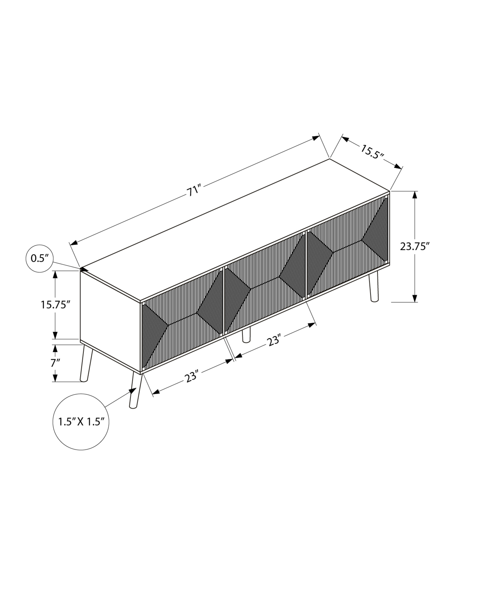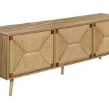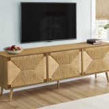 Transform your living space into a chic media entertainment center with this stylish and modern tv stand! This 72-inch long beauty in a light walnut laminate, with cabinet doors crafted in natural seagrass, is the epitome of fashionable style. Durably designed for long-lasting use, this tv stand offers solid wood legs, three spacious closed storage cabinets with an adjustable shelf in the middle cabinet and two wire management holes in the back to keep your space tidy and organized. The push latch mechanism to easily open and close the cabinets showcase a contemporary design, while the easy-to-clean top makes maintenance a breeze. Easy to assemble with step by step illustrated instructions and all hardware included this visually appealing tv stand will be a stand-out in your living room, bedroom, or family room. With a 5 year limited warranty against any defects, you can enjoy peace of mind you have invested in a quality made tv console. Upgrade to a modern mid-century look with this tv stand that combines solid construction with a touch of natural seagrass.